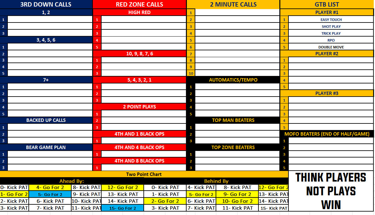 Organizing your Call Sheet, Game-Day Communication, If-Then situations, and the KEY PLAYS that must get called. The "BOX CALL".