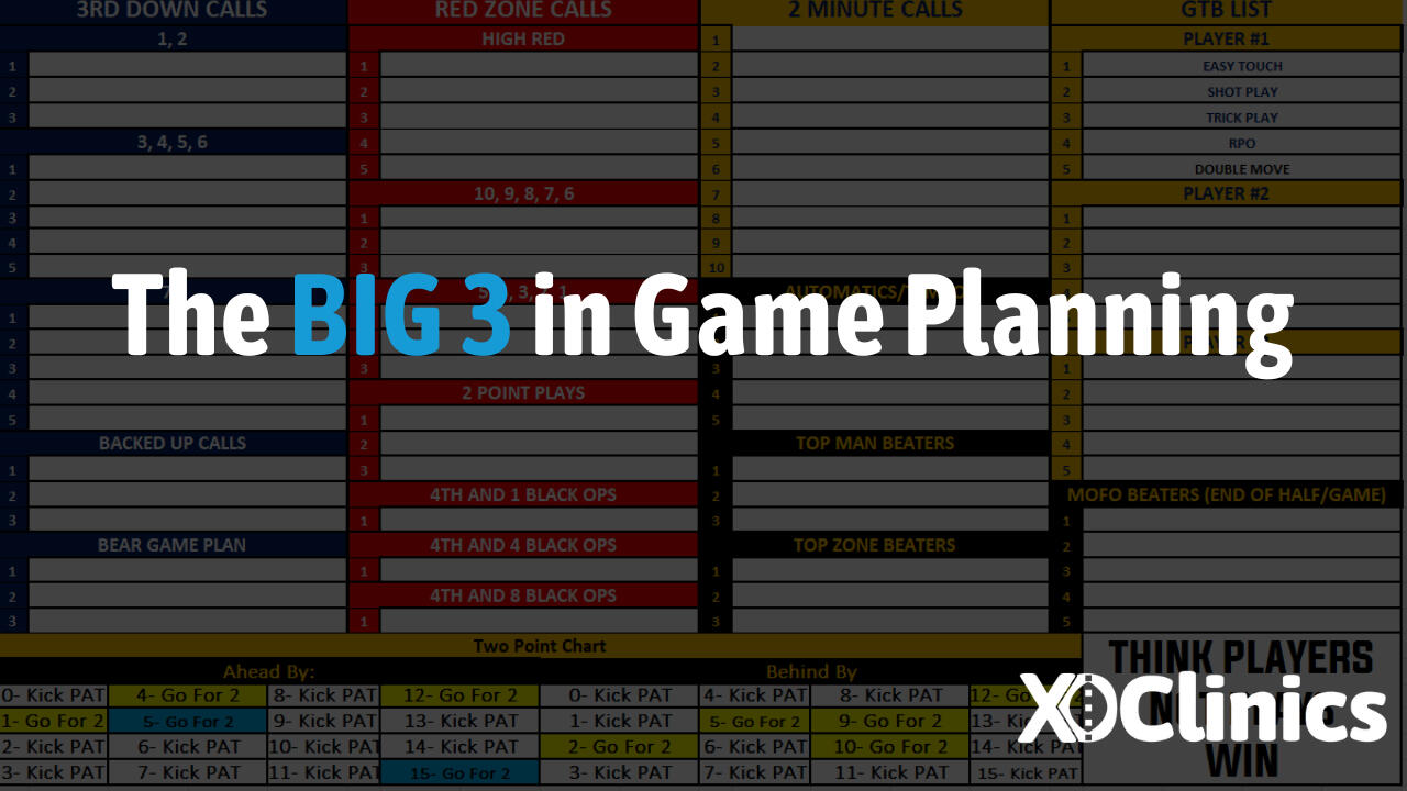This process is a key component for success on Game Day. Putting together your game plans, choosing how many plays you need, building your call sheet, meeting organization, practice organization, and much more.